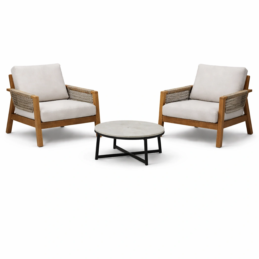 Materiales: Madera de acacia, ratán sintético, estructura de metal. Cojines de espuma con cubierta de poliéster. Mesa de centro con superficie de piedra sintética.